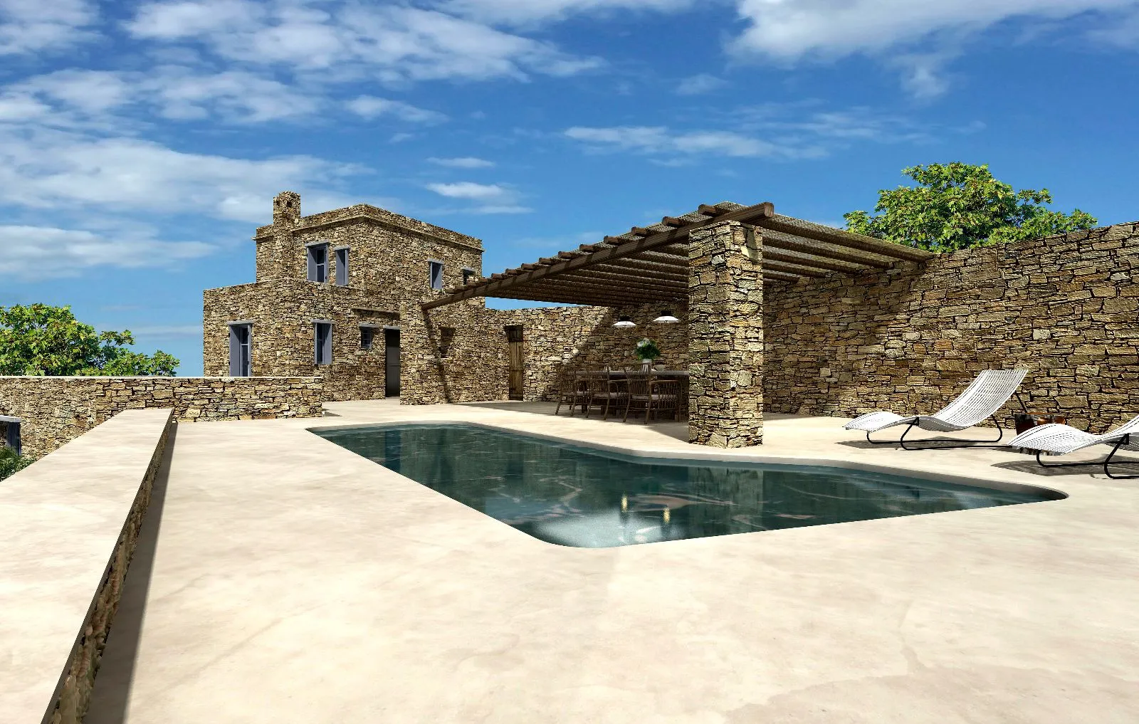 The property includes beautifully landscaped gardens, elegant pergolas, a leisure pool with walk-in access, and a jacuzzi bench. Expansive outdoor areas on the eastern side are ideal for enjoying the August moonrise and breathtaking views of twelve Cycladic islands.